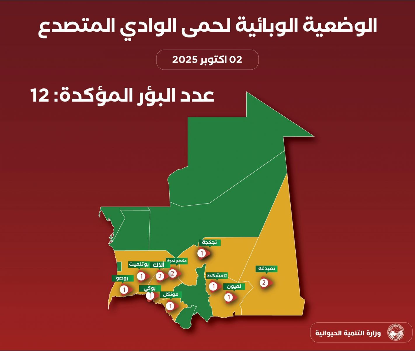 أغشوركيت ( حديث الولاية ) : أعلنت وزارة التنمية الحيوانية، اليوم الجمعة، ارتفاع عدد بؤر حمى الوادي المتصدع في موريتانيا إلى 12 بؤرة، مقابل 10 بؤر في تحديثها السابق.