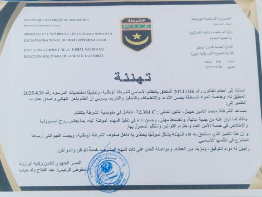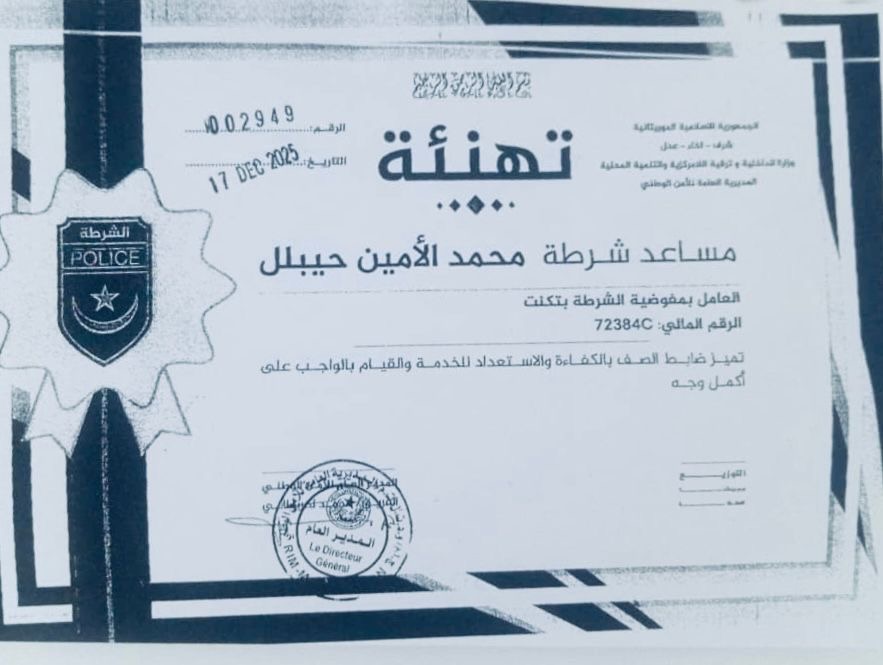 أغشوركيت ( الأخبار الوطنية ) : وجّه المدير الجهوي للأمن بولاية اترارزة تهنئة رسمية إلى مساعد الشرطة محمد الأمين حيبلل، العامل بمفوضية الشرطة بمدينة تكنت، إشادةً بما أبان عنه من كفاءة مهنية عالية، وانضباط مسؤول، واستعداد دائم للخدمة، وأداء متميز في تنفيذ المهام الموكلة إليه.