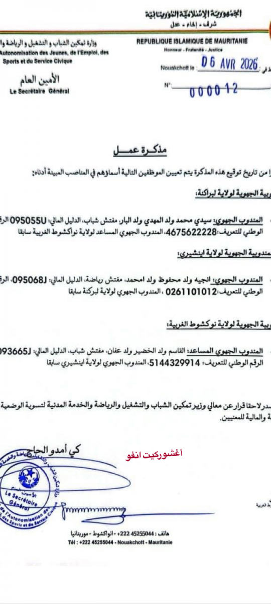 أغشوركيت ( حديث الولاية ) : أصدرت وزارة تمكين الشباب والتشغيل والرياضة والخدمة المدنية، ممثلة في الأمانة العامة - اليوم الاثنين - مذكرة عمل تقضي بإجراء تعيينات جديدة في بعض المناصب التابعة للمندوبيات الجهوية، وذلك في إطار تعزيز الأداء الإداري وتفعيل العمل الميداني على مستوى الولايات.