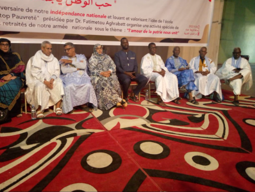 نظمت جمعية "قف للفقر" برئاسة د. فاطمة أغربط مساء أمس السبت 26 نوفمبر 2022 بدار الشباب القديمة في العاصمة نواكشوط. ، حفلا تكريميا بمناسبة الذكرى 62 لعيد الاستقلال الوطني، مؤازرة لأبناء شهداء الجيش ومتقاعديه.