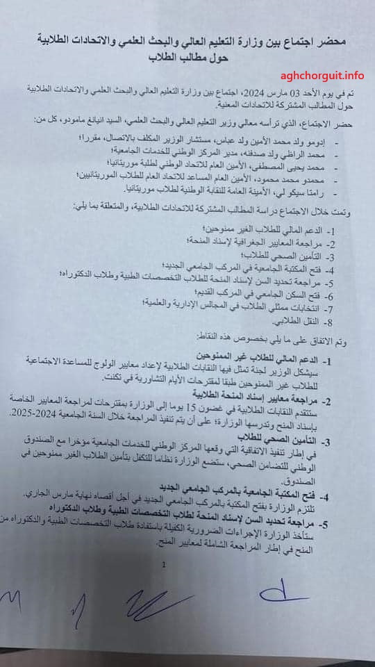 أغشوركيت ( الأخبار الوطنية ) : أعلنت وزارة التعليم العالى والبحث العلمي بموريتانيا توصلها إلى اتفاق مكتوب مع النقابات الطلابية، بعد اجتماع مشترك اليوم الأحد 3 مارس 2024 .